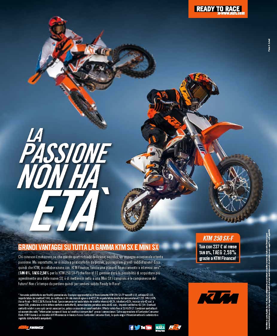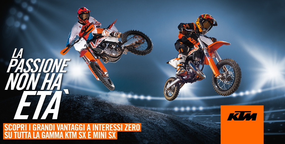 KTM lancia una promozione sulla gamma Cross e Minicross. Fino al 31 gennaio 2017 sarà possibile finanziare i modelli SX e Mini con TAN 0%, pagamento dilazionabile da 12 a 30 mesi e prima rata a 90 giorni! [...]